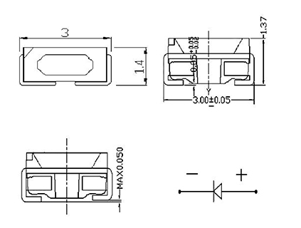 什么是3014側(cè)發(fā)光呢?一般來(lái)說(shuō),LED硬條燈按尺寸大小、燈數(shù)、色溫、亮度(cd--坎德拉)、發(fā)光角度、電壓來(lái)標(biāo)示全稱型號(hào)。所說(shuō)的3014、只是表明LED尺寸大小的行業(yè)簡(jiǎn)稱,即:3014表示LED元件的長(zhǎng)度是3.0mm,寬度是1.4mm;3014側(cè)發(fā)光尺寸圖如下: