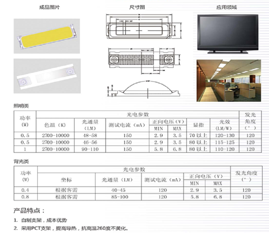 優(yōu)勢(shì):主要代替3014,為日光燈節(jié)省成本,本產(chǎn)品量度高,散熱好