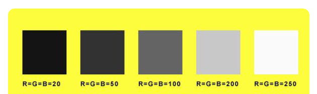 3個數(shù)字都為0,相當(dāng)于3盞燈都沒打開,一片漆黑,就是“黑色”。三個顏色數(shù)量相同時,無色相,顯示為灰色,隨著數(shù)量的增加,由深灰變?yōu)闇\灰。